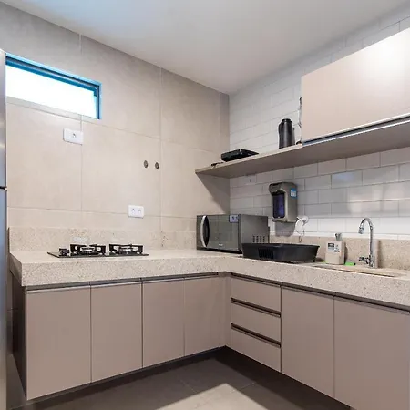 Sim, o apartamento está equipado com cozinha totalmente equipada e oferece refrigerador, torradeira e artigos de vidro. - ❓